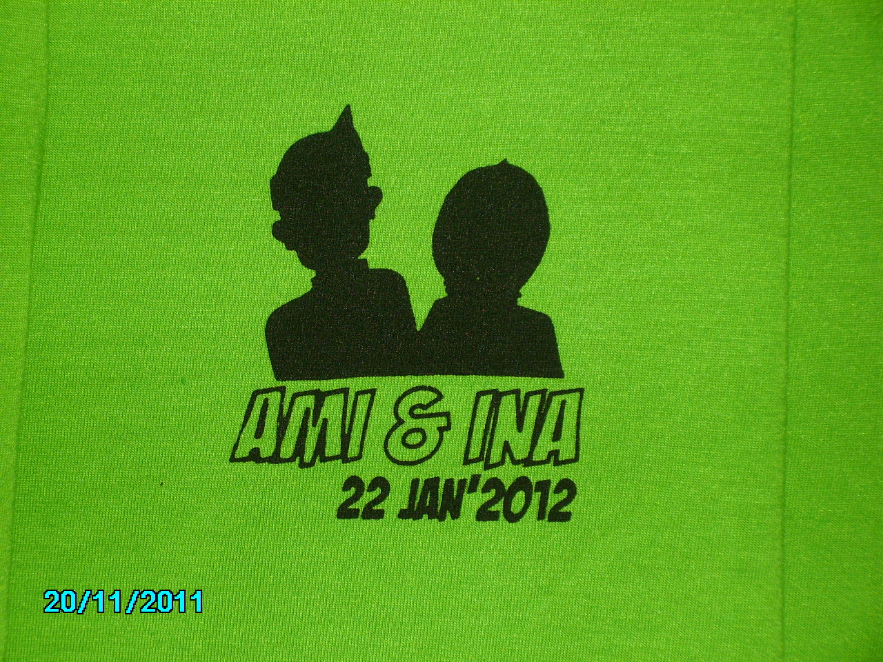 Biasanya baju kawin simple je. Kadang2 ada tulis Ina & Ali le, Siti love Karim le tapi baju ni saya punya idea sendiri. Buat gambar kartun, nama & siap ngan tarikh kawin lagi. Brader ni order hari tu dalam 25 lai. Kejap je siap.