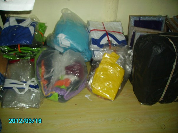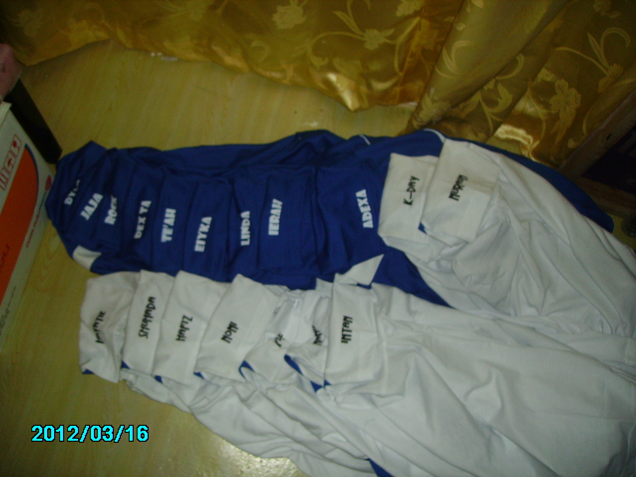 Ni hah….gambar baju2 jersi tu tengah berjemur. Yang warna hitam tu baju goal keeper. Agak komplikated jugak time nak memprint tu tapi berkat kesabaran & kebijakan isteriku, dapat le jugak dia menyiapkan baju tu..on-time.