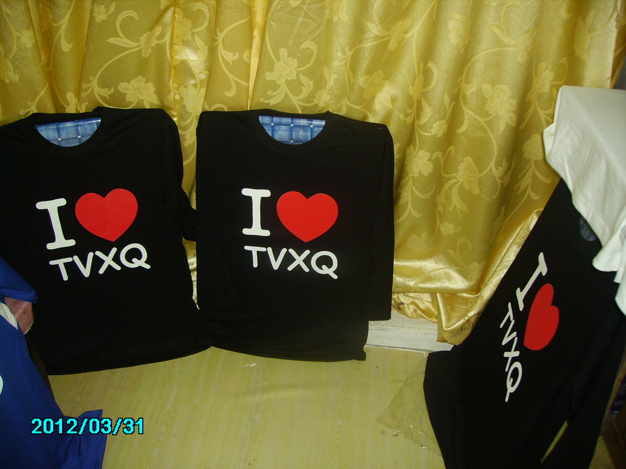 Baju ni simple je guna baju cotton roundneck. Yang I love TVXQ tu guna lengan panjang. Biasanya kalau baju kaler hitam, saya kena tindih putih 2 kali & merah sekali. Kalau tak nanti warna putih tenggelam, tak nampak.