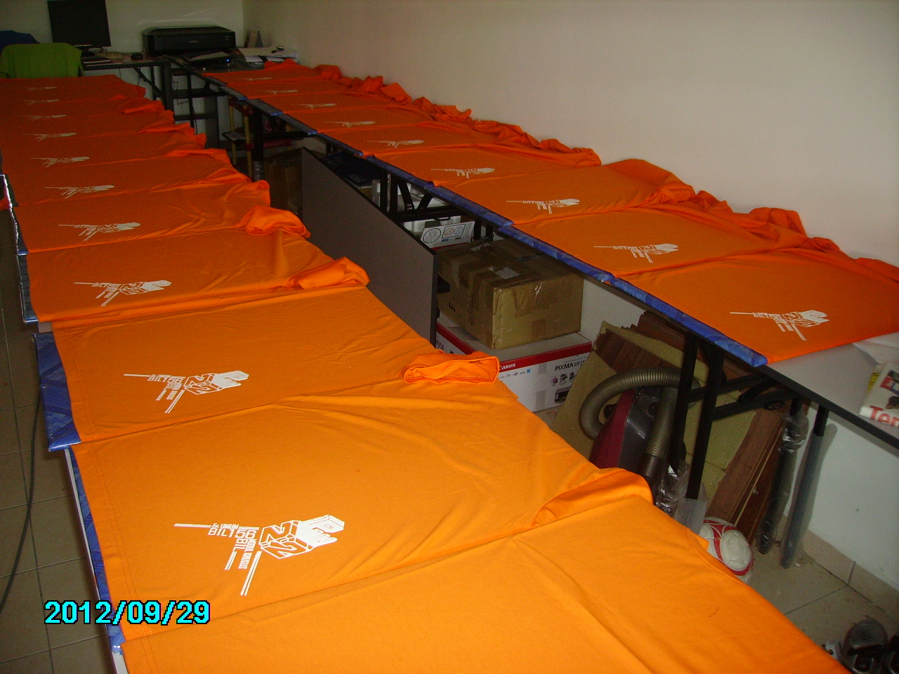 Camni le rupanya baju yang tengah kena dera tu. Satu kali print boleh muat 30 lai. Kalau 100 lai, maknanya dalam 3 ke 4 kali pusingan le nampaknya. Tapi kalau print 1 kaler, Insya Allah masih mampu disiapkan dengan cepat.