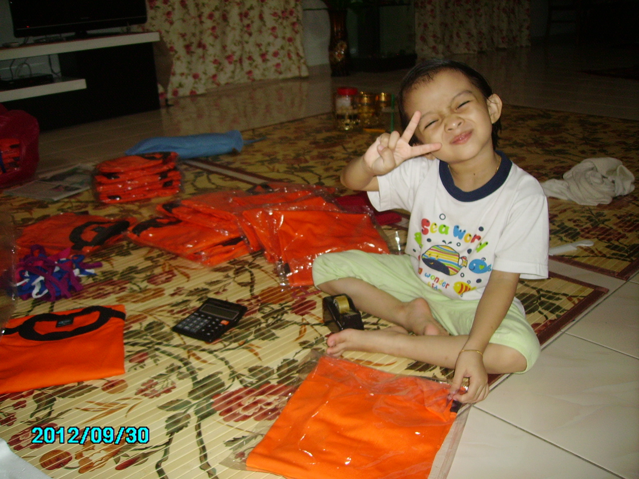 Ini bukan penderaan ni. Memang dia sukarela nak buat tu. Jangan ada yang telefon polis lak. hehehehe…..Mana tahu satu hari nanti ganti mak ayah dia jadi bisneswoman cetak baju lak nanti. Tengok tu. Bukan main khusyuk & tawaduk anakku yang sorang ni buat kerja. Ini le Nik Nurain Syahirah…anakku yang bongsu, umur 4 tahun. Dia le harapan bangsa. Yang kakak ngan abang dia, mintak tolong baru buat.