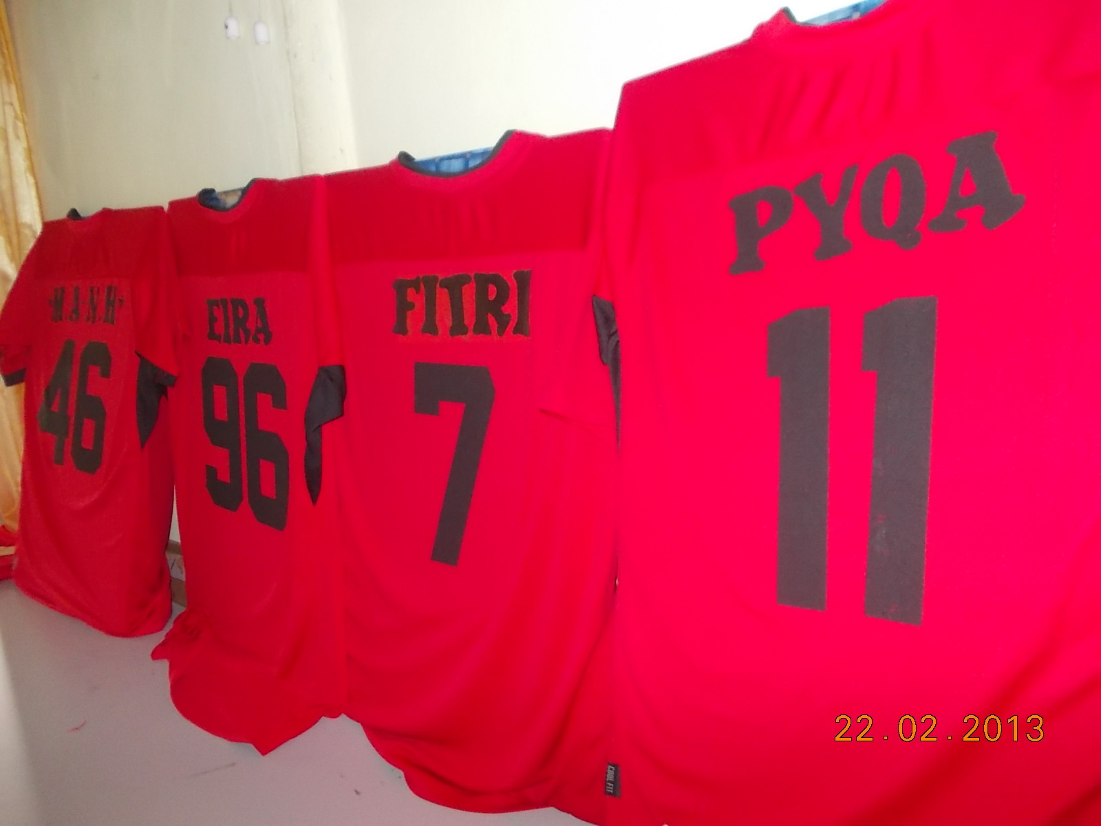 Yang ini pun simple gak. 1 kaler print je. Tapi kalau baju jersi camni, time nak print bahagian belakang yang nama ngan nombor tu ambik masa lama skit sebab kena hati2 takut tersilap. Baju kain jersi Oren Sport.