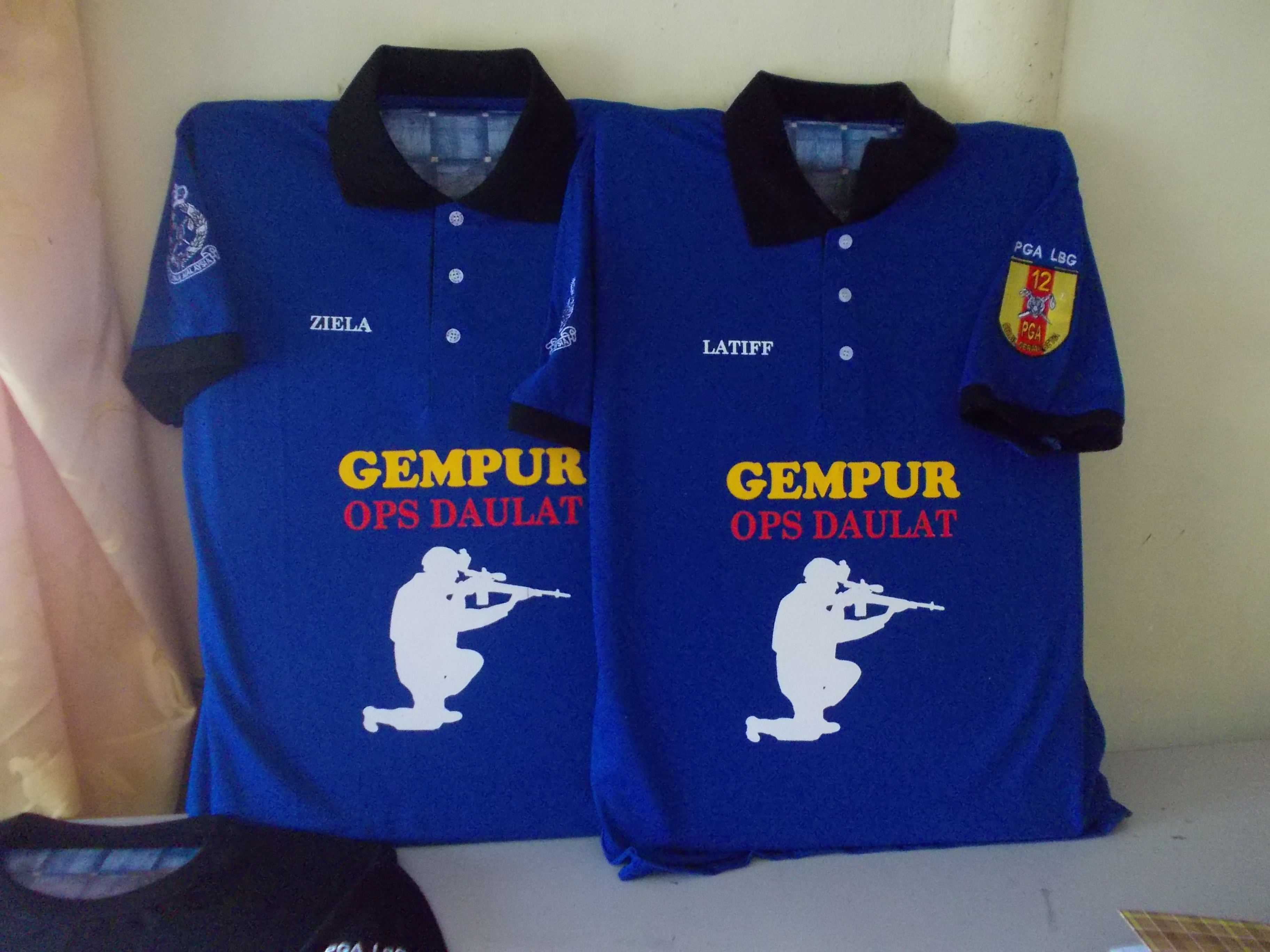 Kat lengan sulam logo polis ngan PGA. Depan belakang print. Cantik tak…..Pastu siap nama sorang2 lagi kat dada tu.