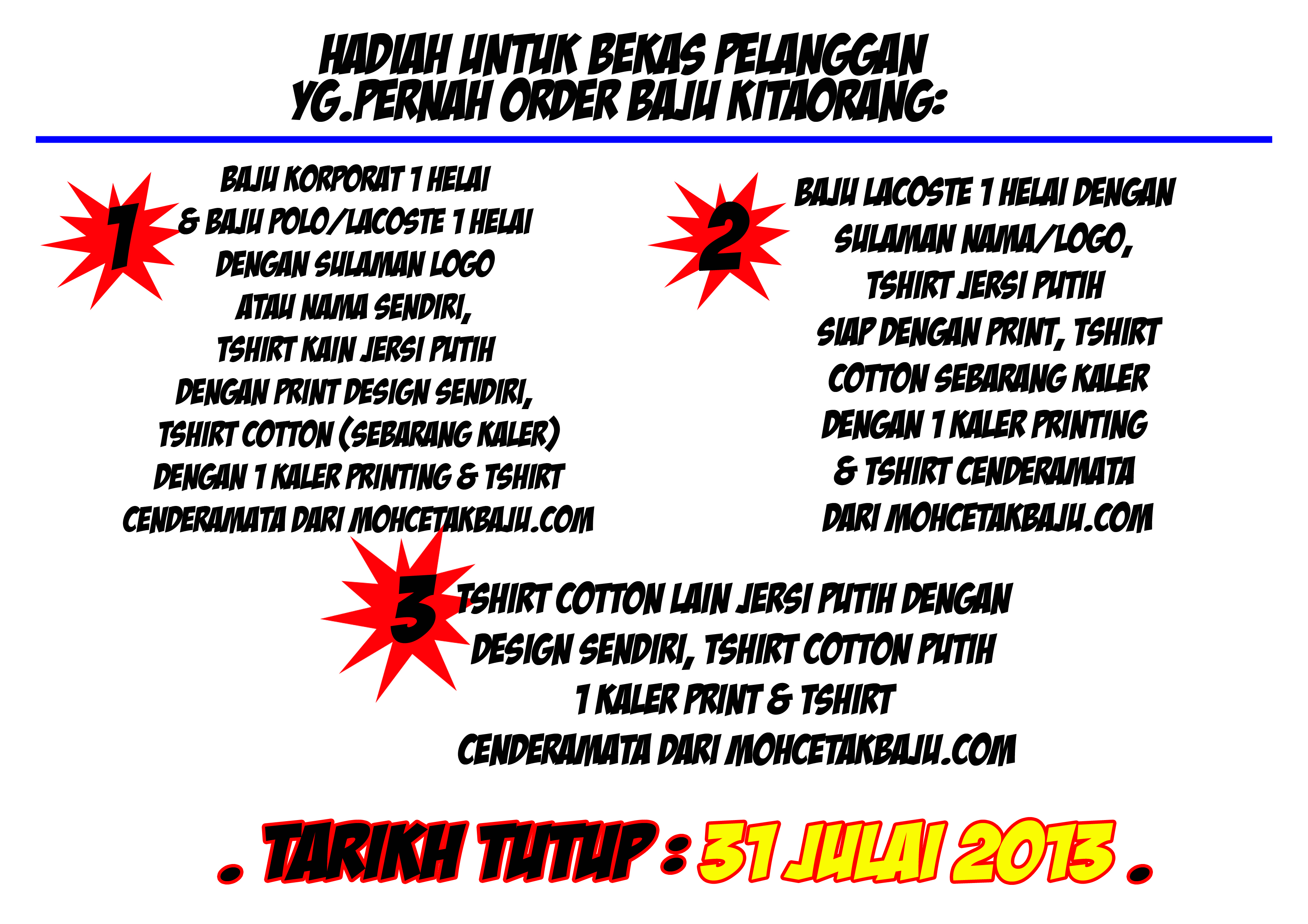 SAPE2 YANG AKAN ORDER BAJU DALAM TEMPOH SEHINGGA 31 JULAI 2013 NI, KORANG BERPELUANG DAPAT HADIAH IKUT KATEGORI BEKAS PELANGGAN KITAORANG.