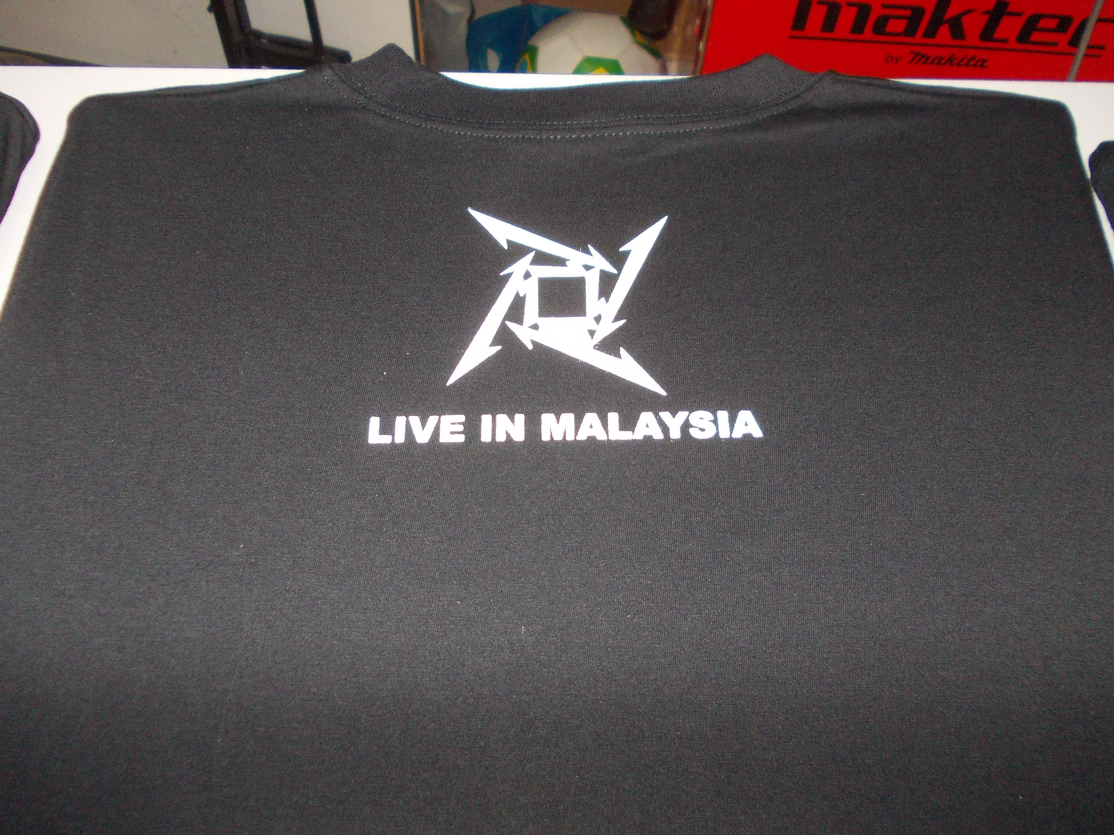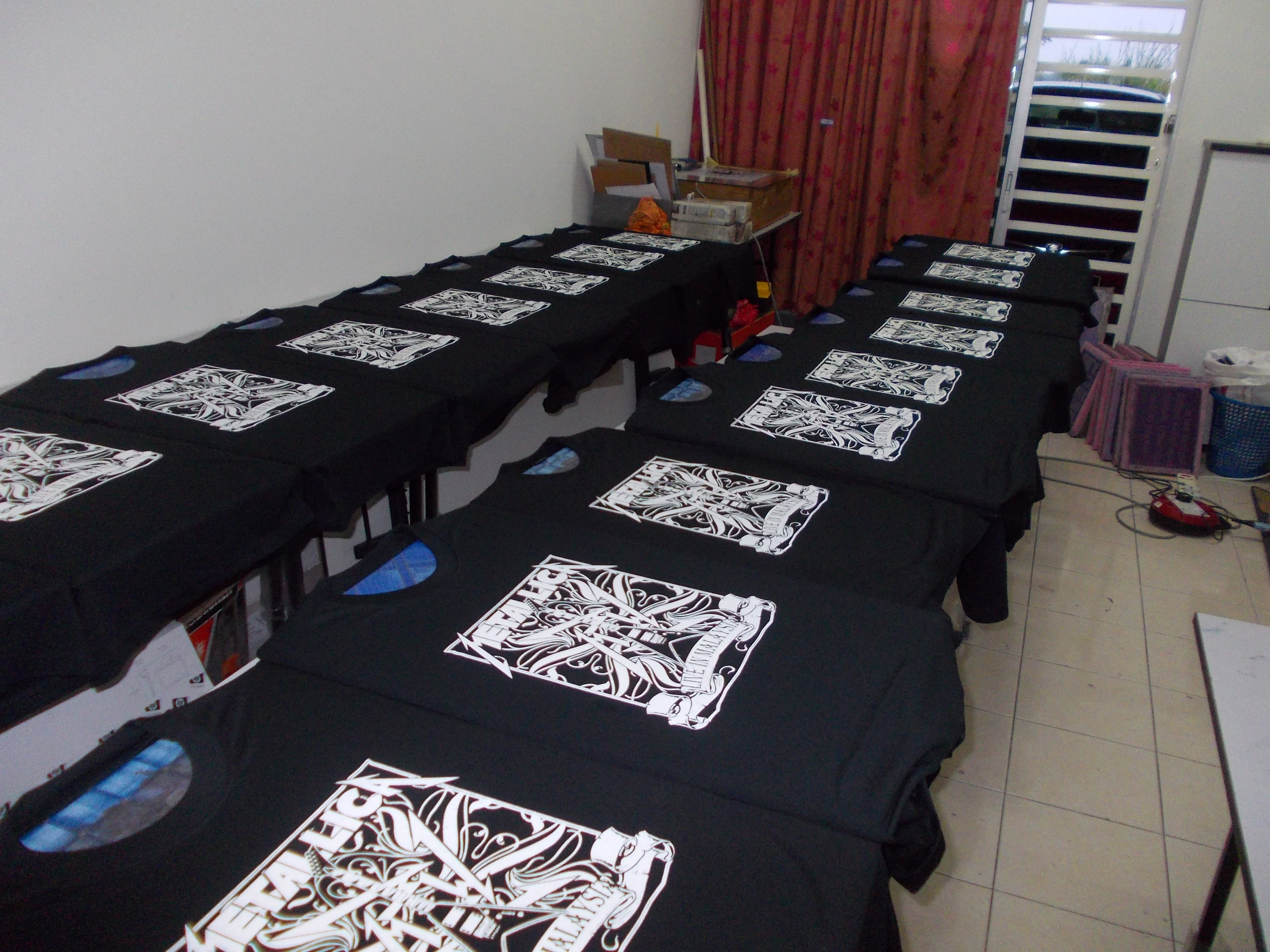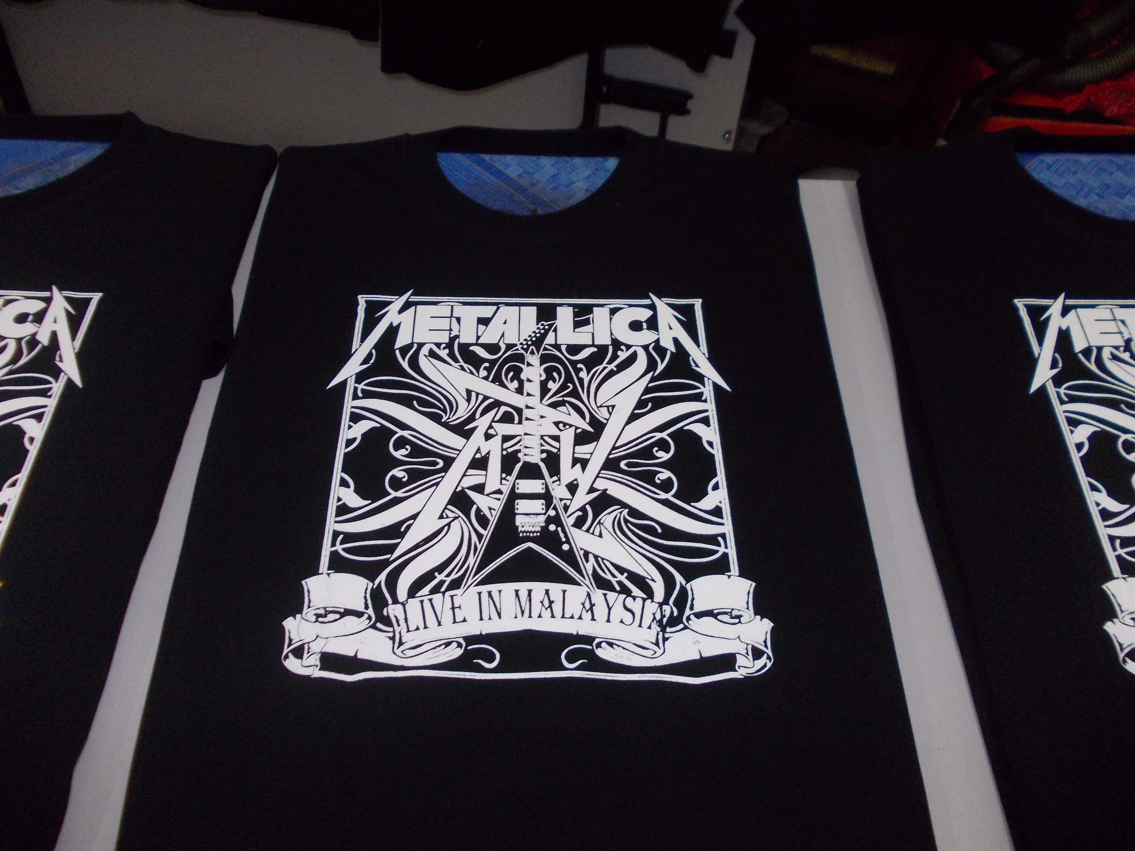 Baju ni customer ni nak bawak pegi tengok konsert live Metallica nanti. So, memandangkan 2 kaler print je. So, agak mudah nak print tapi camane pun kaler putih mesti kena layang atau print 2 kali biar naik betul kaler dia. Kalau guna rubber dye biasa ni, kitaorang print dulu sekali, pastu bagi kering skit, baru print kali kedua. Tu yang naik kaler putih tu.