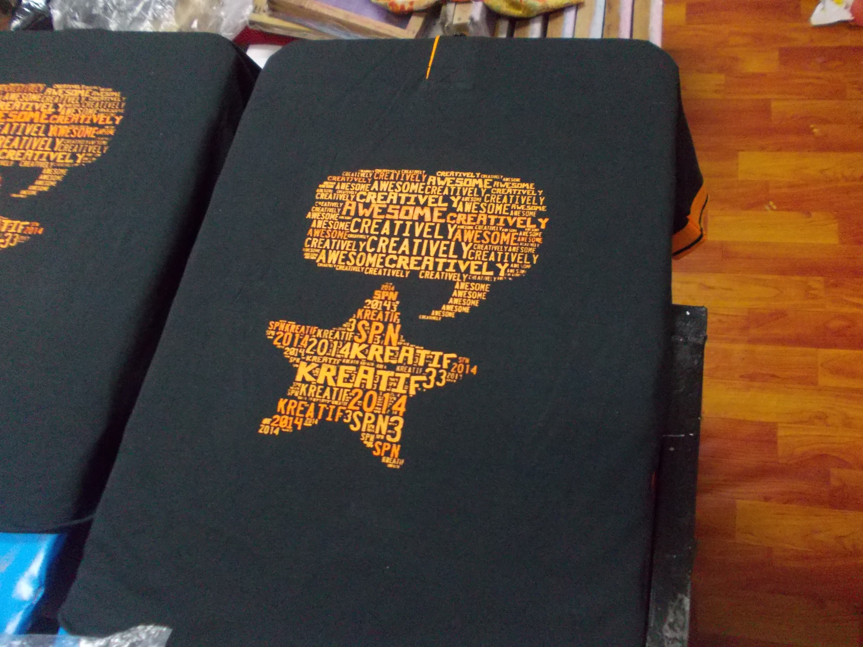 Actually saya guna 1 blok printing je ni. Masa nak print kaler putih, saya tutup design kaler oren. Pastu, masa nak print oren, saya tutup design yang kaler putih & jadikan design kaler putih tu sebagai marking supaya masa print tu, jarak printing sama je semua baju. Itulah sebenarnya rahsia kitaorang printing tanpa guna locking.
