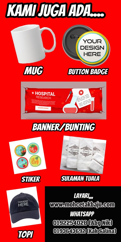 Just tambah je printing…sehelai tak sampai pun RM20 kalau cetak 1 warna…In Sha Allah.