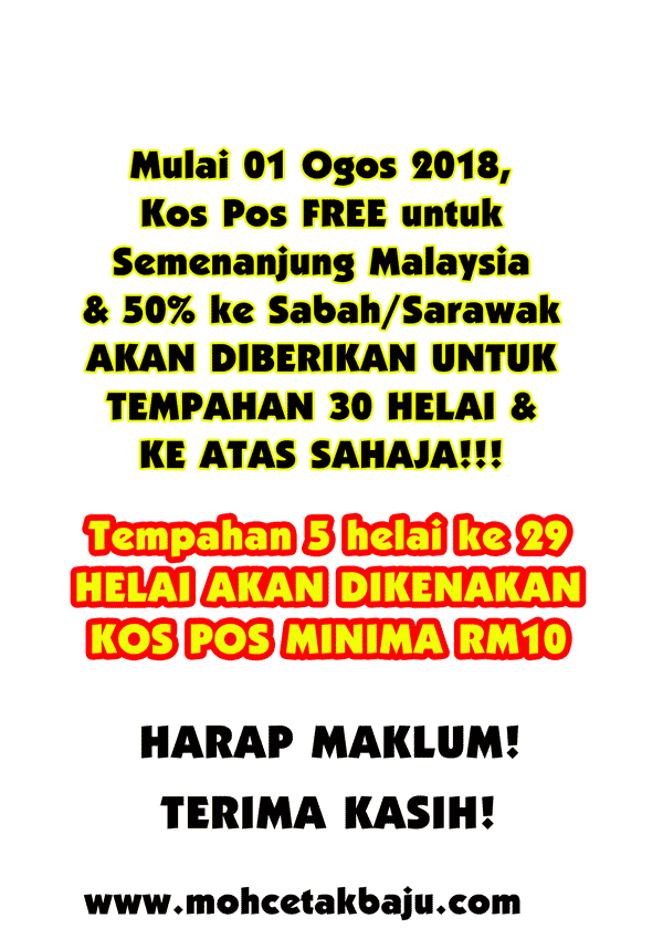 Just tambah je printing…sehelai tak sampai pun RM20 kalau cetak 1 warna…In Sha Allah.