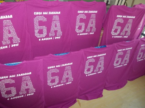 Setakat wording biasa & lencana sekolah je. Baik tak yah buat TShirt kelas cam tu…..