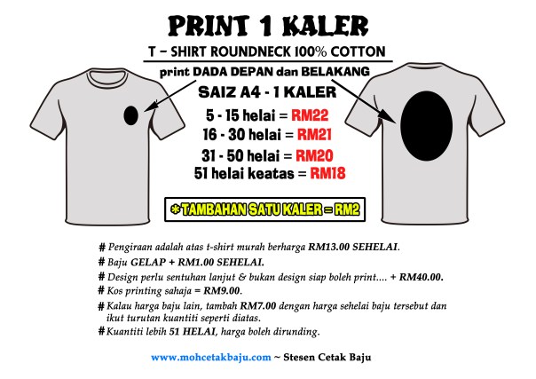 Berikut adalah Senarai Harga tshirt sekali dengan printing.