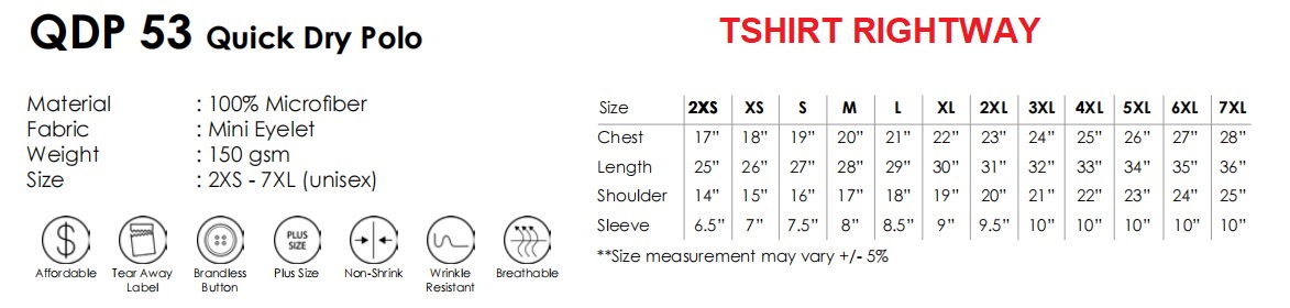 SAIZ DAN UKURAN TSHIRT RIGHTWAY LENGAN PENDEK BERKOLAR MICROFIBER