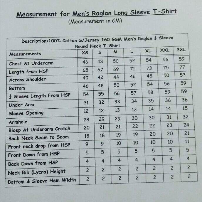 Ukuran Baju Raglan Lengan 3 Suku TShirt