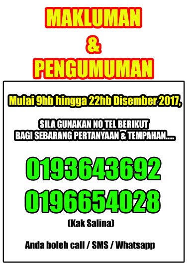 3. SMS atau Whatsapp ke nombor hp kitaorang….Abang Nik – 0196654028 / 0192254028 atau Kak Salina – 0193643692 atau